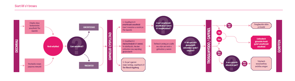 - Dogfen ganllaw a thiwtorial (fideo) ar fonitro risg ansolfedd ac achub cofnodion busnes. Mae hyn yn dilyn pob cam o’r broses o ymchwilio ac adnabod cwmnïau ansolfent sydd â chofnodion o werth archifol, i gysylltu ag ymarferwyr ansolfedd, a threfnu i roi cofnodion i’ch gwasanaeth.